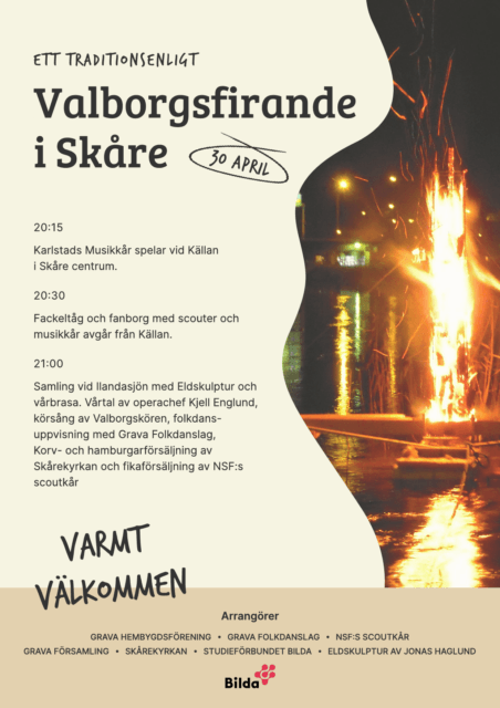 Samling för fackeltåg 20.15 vid Källan. Brasan tänds på Ilandaskolans skolgård ca 21.00 Korv och fika serveras. Värmlandsoperans chef, Kjell Englund, vårtalar och valborgskören sjunger. Öppen kyrka i Skårekyrkan med café och möjlighet att ex. spela spel och värma sig efter brasan!