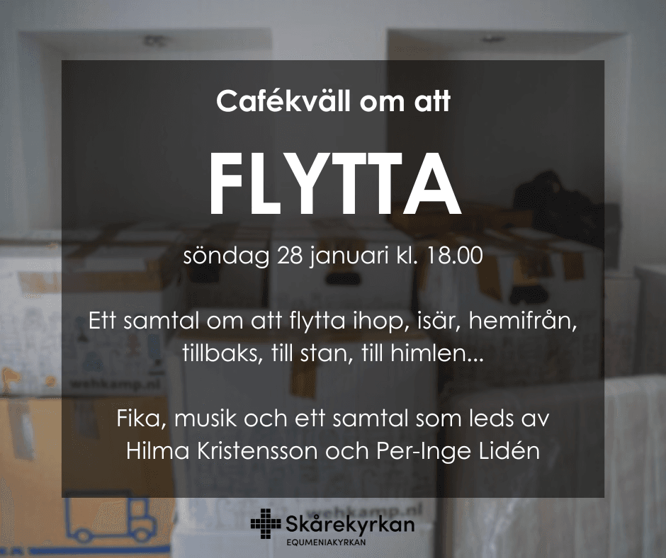 Alla intresserade är varmt välkomna till en cafékväll om Att flytta - en kväll om att flytta ihop, isär, hemifrån, tillbaks, till stan, till himlen... Det blir fika, musik och ett samtal som leds av Hilma Kristensson och Per-Inge Lidén! |