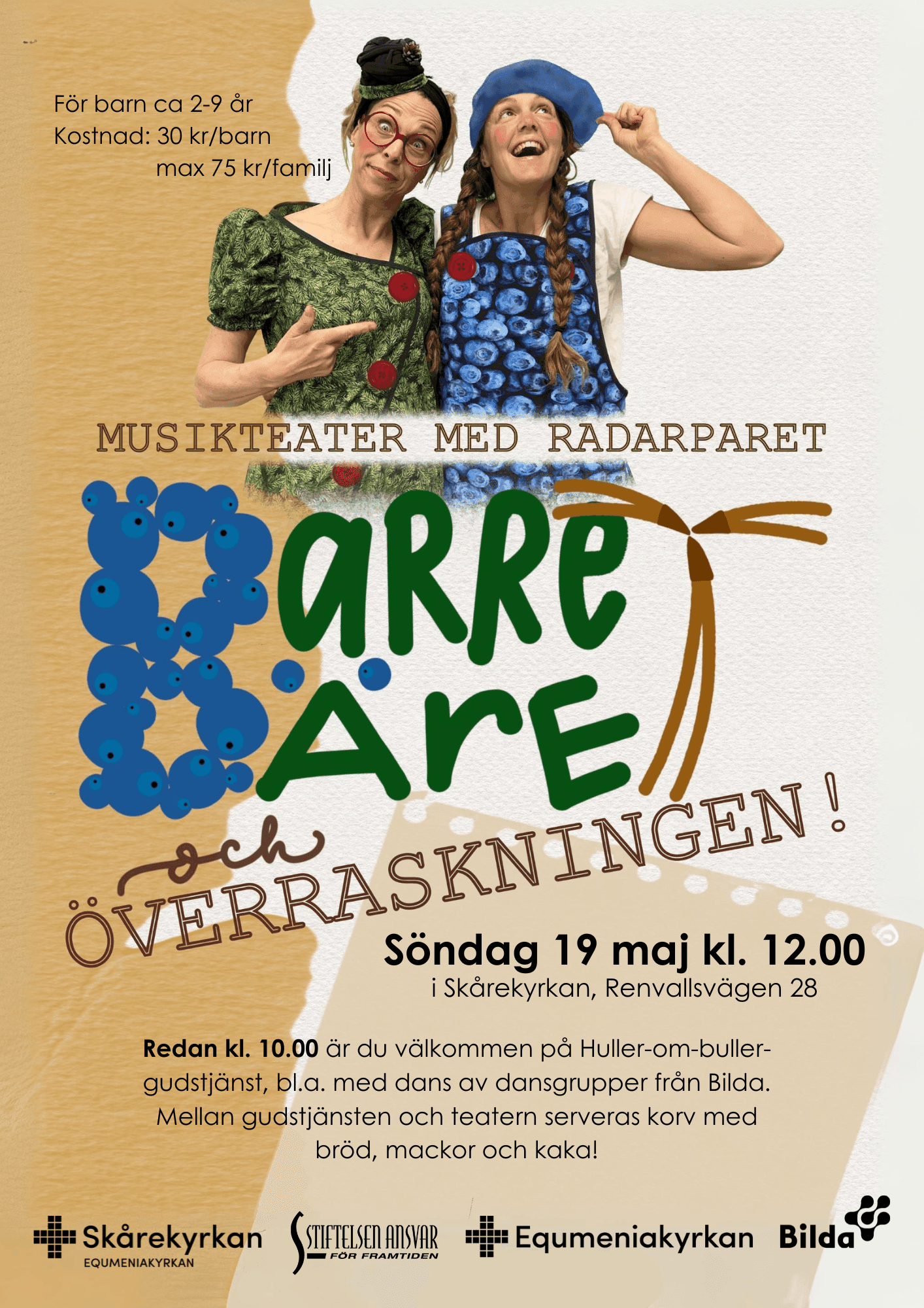 2 evenemang,![]() ![]() Välkommen på huller-om-buller-gudstjänst i Skårekyrkan! Dansgrupper som övar i Skårekyrkan dansar för oss och Maja Floberg predikar. Idag läser vi Efesierbrevet 2:14-18. Till fikat efter gudstjänsten finns korv med bröd och för den som vill kan en stanna på familjeteatern som börjar kl. 12.00! ommen på gudstjänst i Skårekyrkan! ![]() ![]() Välkommen på familjeteater i Skårekyrkan! En härlig föreställning i musikens tecken med mycket sång, lekfullhet och finurlig dialog. Publiken bjuds in att sjunga med i sångerna under denna dryga halvtimmes långa föreställning, som garanterat avslutas i glädje, sång och dans! De båda vännerna Barret och Bäret har filat på en överraskning en tid, och nu […] |