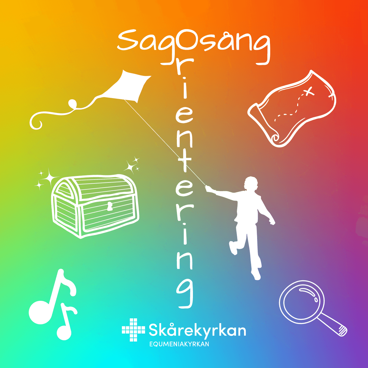 Alla som vill, (riktar sig främst till barn 3-8 år och deras vuxna), går en kort orienteringsrunda (barnvagnsvänlig) och letar efter ledtrådar, sjunger sånger, ramsor, får höra berättelser och så hittar vi små skatter. Efteråt fikar vi i Skårekyrkan.